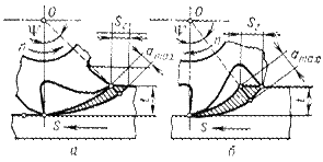 Фасонные фрезы (рис. 6.4, л) предназначены для фрезерования стандартных фасонных поверхностей, стружечных канавок режущих инструментов. Комбинированные поверхности фрезерую т набором фрез (рис.6.4, н). Цилиндрическое и торцовое фрезерование в зависимости от направления вращения фрезы и направления подачи заготовки можно осуществлять двумя способами: – фрезерованием против подачи (встречное), когда направление вращения фрезы направлено против направления подачи; – фрезерованием в направлении подачи (попутное), когда направ-ление вращения фрезы совпадает с направлением подачи. При встречном фрезеровании нагрузка на зуб возрастает от нуля до максимума, при этом сила, действующая на заготовку, стремится оторвать ее от стола, что приводит к вибрациям и увеличению шеро-ховатости обработанной поверхности. Преимуществом встречного фрезерования является работа зубьев фрезы «из-под корки», т. е. фреза подходит к твердому поверхностному слою снизу. Недостатком является наличие начального скольжения зуба по наклепанной поверхности, образованной предыдущим зубом, что вызывает повышенный износ фрезы. При попутном фрезеровании зуб фрезы сразу начинает срезать слой максимальной толщины и подвергается максимальной нагрузке. Это исключает начальное проскальзывание зуба, уменьшает износ фрезы и шероховатость обработанной поверхности. Сила, действующая на заготовку, прижимает ее к столу станка, что уменьшает вибрации. При работе торцовыми и концевыми фрезами различают: – симметричное резание, когда ось фрезы совпадает с линией симметрии заготовки; – несимметричное резание, когда ось фрезы не совпадает с линией симметрии заготовки.