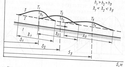 (1- дно, 2 – поверхность воды до паводка, 3 – волны паводка.)