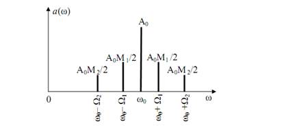 Ясно, что спектр будет содержать пять составляющих (рис. 46), а ширина спектра определяется наивысшей частотой управляющего колебания