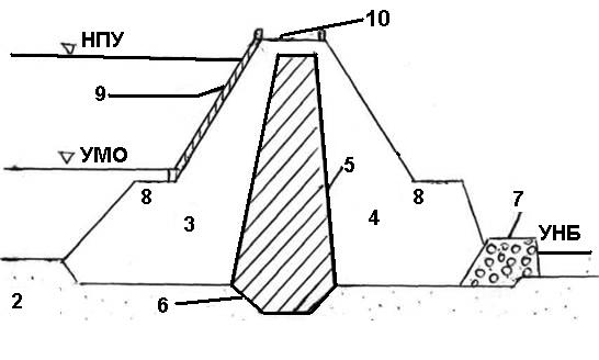 Рис. 32. Элементы грунтовой плотины 1 - водоупор 2 - основание 3 - 4 - верхняя-нижняя призмы 5 - противофильтрационное устройство в теле 6 - то же в основании 7 - дренажное устройство 8 - бермы 9 - крепление откоса 10 - гребень