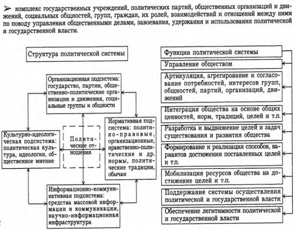 Одним из важнейших понятий политологии является понятие политической системы. Существуют десятки определений этого понятия. В самом общем виде под политической системой понимается: