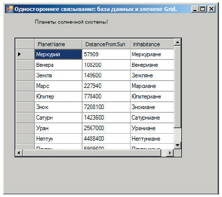 // Указываем заголовок окна this.Text = "Двустороннее связывание:" + " база данных и элемент Grid."; // Добавляем элементы управления - //метку, таблицу и командную кнопку Label labelCaption = new Label(); labelCaption.Text = "Планеты!"; labelCaption.Location = new Point(60, 10); labelCaption.Width = 200; labelCaption.Parent = this;