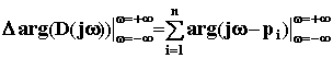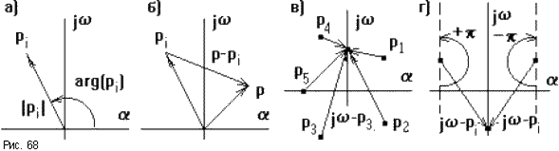 Каждый корень можно изобразить вектором на комплексной плоскости (рис.68а), тогда разность p - pi изобразится разностью векторов (рис.68б), где p - любое число. Еcли менять значение p произвольным образом, то конец вектора p - pi будет перемещаться по комплексно плоскости, а его начало будет оставаться неподвижным, так как pi - это конкретное неизменное значение. В частном случае, если на вход системы подавать гармонические колебания с различной частотой D(j При этом концы векторов j Характеристический полином можно представить в виде D(j где |D(j arg(D(j Пусть из n корней m - правые, а n - m - левые, тогда угол поворота вектора D(j