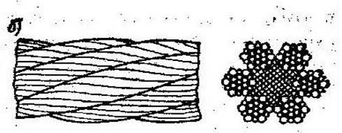 2) Двойной свивки – когда проволоки предварительно свиваются в пряди (стренги), а затем несколько прядей свивают вокруг мягкого или жесткого сердечника в канат.