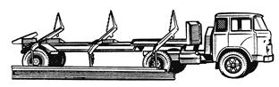 Кассетные полуприцепы-панелевозы (б) имеют две боковые плоские несущие фермы. Они обеспечивают лучше, чем хребтовые, защиту панелей от механических воздействий и грязи при транспортировании, а также способствуют повышению эффективности их использования, так как форма кассеты (грузовой платформы) позволяет перевозить железобетонные изделия широкой номенклатуры. Однако кассетные полуприцепы-панелевозы имеют повышенную металлоемкость конструкции и, следовательно, большую собственную массу, более сложное крепление панелей в кассете, а также худшую приспособленность к ПРР. С целью повышения маневренности полуприцепы-панелевозы оборудуются специальными устройствами для управления их колесами. Для сохранения перевозимых грузов металлические части их ферм, соприкасающиеся с панелями, покрываются резиновыми или деревянными прокладками. Фермовозы – низкорамные полуприцепы кассетного типа с поворотными тележками. Фермы на полуприцепах-фермовозах перевозятся в вертикальном положении.