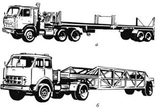 Седельно-сцепное устройство снабжено замком, обеспечивающим полуавтоматическую сцепку и расцепку автомобиля-тягача и полуприцепа (автоматически выполняется сцепка) и предотвращающим их произвольную расцепку. Автопоезда для длинномерных грузов предназначены для перевозки леса, труб, сортового металла различных профилей и строительных железобетонных конструкций (плит, панелей, ферм, балок, санитарно-технических кабин и т. п.). Для перевозки леса, металла и труб используются одно- и двухосные прицепы-роспуски соответствующей грузоподъемности. Саморазгружающиеся автопоезда для длинномерных грузов обеспечивают саморазгрузку за счет расположенных на автомобиле, прицепе или полуприцепе приводных устройств, либо за счет наклона грузовых площадок под действием веса груза.