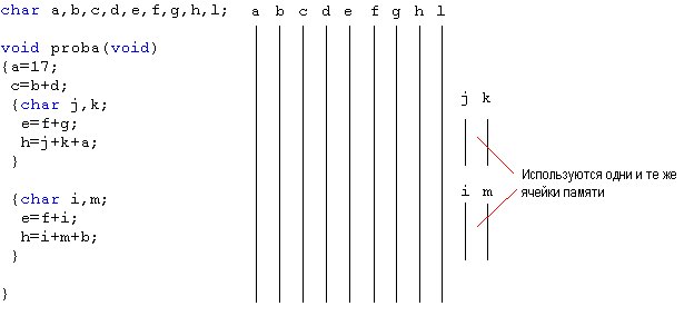 void tmp(void) {i=5; } Некоторые блоки могут содержать структурные операторы, как показано в следующих примерах. Использование внутренних блоков позволяет объявлять локальные переменные. Использование локальных переменных позволяет использовать одни и те же ячейки памяти для различных переменных* и тем самым экономить ресурсы памяти данных. Пример 1: