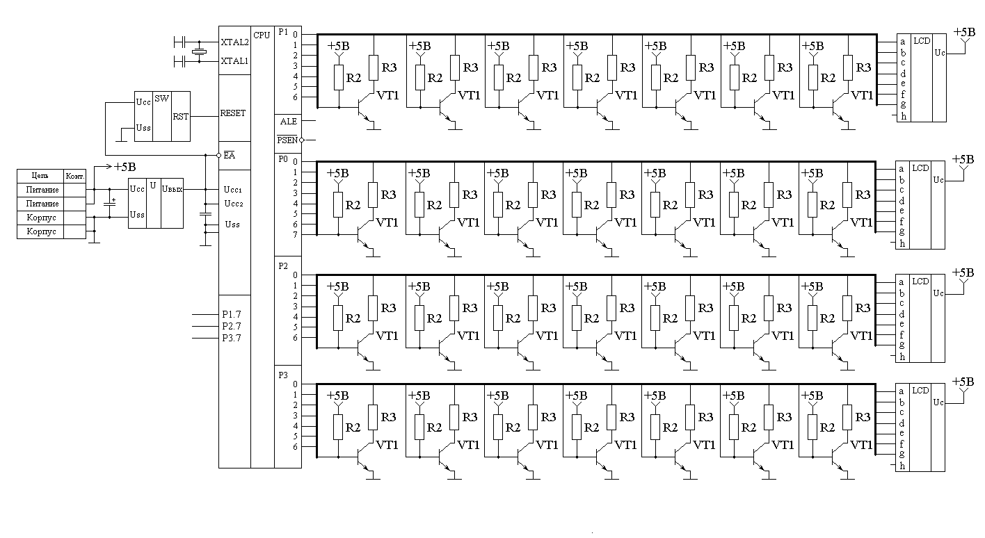 Рисунок 2. Принципиальная схема подключения микроконтроллера. Получившаяся принципиальная схема часов приведена на рисунке 3.