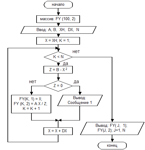 В данном случае таблица должна содержать два столбца; первый столбец для аргумента Х и второй - для функции У. В качестве исходных данных для организации вычислительного процесса зададим ХН, ДХ и N. Кроме того, входными данными являются параметры функции A и B. Результаты будем накапливать в массиве FY(100,2), то есть таблица может содержать не более 100 строк (количество строк в таблице определяется характером решаемой задачи и определяется программистом). Функция содержит знаменатель, поэтому в алгоритме необходимо предусмотреть проверку знаменателя на равенство нулю. Так как нулевой может быть всего одна точка, то после вывода сообщения (например, такого: точка разрыва – знаменатель равен нулю") можно продолжить вычислительный процесс. Схема алгоритма решения этой задачи приведена на рис.3.11.1. В алгоритме, кроме указанных выше переменных, используются следующие переменные: К – счетчик циклов (параметр цикла); Х – текущее значение аргумента; Z – значение знаменателя. Во втором блоке на рис.3.11.1указан размер массива. После ввода исходных данных задаются начальные значения Х и К и далее организован циклический процесс вычисления функции У (цикл с предусловием). В каждом цикле сначала вычисляется значение знаменателя (Z) и осуществляется проверка Z на равенство нулю.