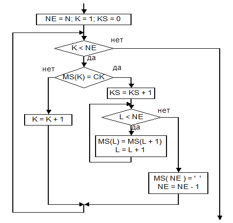 Фрагмент схемы алгоритма исключения символов приведен на рис.3.11.3. В схеме алгоритма обозначено: N – количество символов в массиве MS; NE – динамическая длина массива; K, L – счетчики (параметры циклов); KS – количество исключенных символов.
