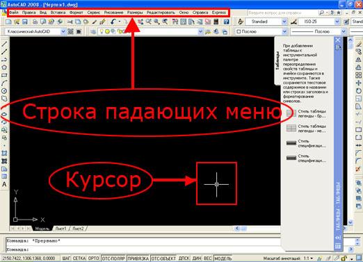 В самом верхнем участке экрана программы располагается строка падающих меню. В её состав входят 12 подменю: файл, правка, вид, вставка, формат, сервис, рисование, размеры, редактировать, окно, справка, express. В каждом меню можно выбрать определённое действие. Пользуясь данной строкой меню можно запускать различные команды и процессы. Например можно запустить команду рисования прямоугольника зайдя в подменю "рисование" и выбрав там пункт "прямоугольник". На рисунке ниже показано расположение строки меню; помимо того там показан курсор, принимающий в программе вид "прицела", "перекрестья". Данным курсором можно управлять с помощью мыши, с его помощью можно визуально задавать координаты в поле чертежа, выбирать различные объекты для редактирования.