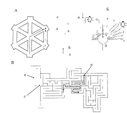 Рис. 3.9. Схема опытов по изучению отсроченных реакций. А — демонстрация приманки и пустого контейнера; Б — приманку и пустой контейнер закрывают от животного непрозрачным экраном; В — экран убирают, и животное имеет возможность достать приманку, положение которой не изменилось При следующем предъявлении этого теста контейнер с приманкой может располагаться слева. В процессе обучения у животного формируется «когнитивная карта» всех признаков лабиринта, или его «мысленный план». Затем на основе этого «плана» животное выстраивает свое поведение. Толмен и его последователи исследовали формирование «мысленного плана» («карты») с помощью лабиринтов разных конструкций, траекторию движения в которых животные могли менять в зависимости от того, были ли им доступны более короткие пути. В работе Н. Чапиуса и П. Скардигли (цит. по: Реагсе, 1998) хомячка помещали в камеру А гексагонального лабиринта (рис. 3.10А), в котором ему «надлежало» пройти за пищей по пути, указанному штриховой линией. От этой дороги хомячок не отклонялся, поскольку все входы в другие отсеки были закрыты. После запоминания этого пути во время целого ряда предъявлении задачи в лабиринте открывали все дверцы, за исключением той, которая позволяла попасть к корму по прямой. Теперь кратчайшим путем к пище стала траектория через центр (сплошная линия). Этот путь можно уверенно найти, только имея «мысленный план» данного лабиринта. После определенной тренировки хомячки выбирали этот путь достоверно чаще, чем остальные. Два других примера, взятых из работы самого Толмсна, показывают, как животное находит новый путь к пище, если знакомая дорога перекрыта (рис. 3.10Б и В). Образование «мысленного плана» может происходить и в отсутствие подкрепления, в процессе ориентировочно-исследовательской активности. Этот феномен Толмен назвал латентным обучением (см. 3.4.2). Сходных взглядов на организацию поведения придерживался И. С. Бериташвили (1974). Ему принадлежит термин — «поведение, направляемое образом». Бериташвили продемонстрировал способность собак к формированию представлений о структуре пространства, а также «психонервных образов» предметов. Ученики и последователи И. С. Бериташвили показали пути видоизменения и совершенствования образной памяти в процессе эволюции (Натишвили, 1987), а также в онтогенезе (Бадридзе, 1987), базируясь на данных по пространственной ориентации животных. Гипотеза о когнитивных механизмах многих форм поведения закономерно возникала у исследователей, пытавшихся осмыслить данные самых разнообразных экспериментов. Американский ученый Д. Гриф-фин (Griffin, 1984) в книге «Мышление животных» («Animal thinking») в популярной форме рассматривает факты, хотя и не всегда действительно относящиеся к сфере мышления животных, но явно не получавшие объяснения в терминах бихевиоризма (например, орудийная деятельность и сложные виды коммуникации). Когнитивная психология человека — направление, возникшее как реакция на господство идей бихевиоризма в области изучения психики человека, — оказала влияние на исследования когнитивных процессов