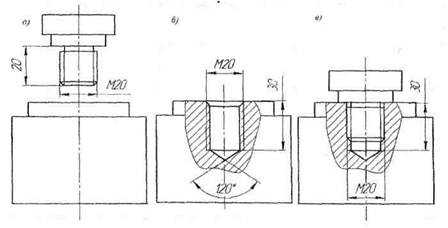 Порядок выполнения задания: 1.Уяснить форму и размеры соединяемых деталей. 2.Определить место соединения деталей. Место гнезда (отверстие с резьбой) в базовой детали в задании обозначено осевой линией. 3.Выполняют сверление гнезда и нарезают резьбу номинальным диаметрам резьбы посадочного конца ввинчиваемой детали, глубина гнезда l2 (рис.6,6) определяется: l2=l1+4Р, где: l1 - длина посадочного конца детали, l1=20mm; Р - шаг резьбы, 4Р - запас резьбы в отверстии, Р=0,25мм для резьбы М20 l2=20+4х0,25=30мм. 4.Вычерчивают резьбовое соединение двух деталей. При вычерчивании соединений следует запомнить правило: в резьбовых соединениях, изображенных в разрезе, резьба стержня закрывает резьбу отверстия (рис.6,в). Обратите внимание на то, что на разрезах штриховка доводится до сплошных основных линий. Болтовое соединение/ Крепёжными деталями болтового соединения являются: болт, гайка, шайба. Болт представляет собой цилиндрический стержень с наружной резьбой с одного конца головкой с другого. Резьбовая часть предназначена для навинчивания на болт гайки, головка служит упором и элементом для захвата ключом. Гайка представляет собой чаще всего шестигранную призму с цилиндрическим отверстием, в котором нарезана внутренняя резьба для навёртывания на болт. Шайба устанавливается между гайкой и деталью служит для распределения давления со стороны гайки по поверхности детали (плоская шайба) или предотвращения откручивания гайки в процессе эксплуатации соединения (пружинная шайба). Соединение болтами применяется, если возможно выполнения сквозных отверстий в стягиваемых деталях. Монтаж болтовых соединений требуется страховки болта от проворачивания при затяжке гайки. Желательна фиксация