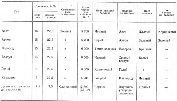 Балони. Для зберігання й транспортування стислих і зріджених захисних, газів використають сталеві балони (р < 20 МПа), виготовлені за ГОСТ 949-73. Газ у цих балонах перебуває при температурі навколишнього повітря. Для транспортування й роздачі на зварювальні пости аргону, гелію, вуглекислого газу, азоту й водню використають в основному сталеві балони місткістю 40 л. Аргон, гелій, азот і водень перебувають у балонах у газоподібному стані при тиску 15 МПа, а вуглекислий газ — у зрідженому при тиску 6—7 МПа. Балон місткістю 40 л при тиску 15 МПа й температурі 20 °С містить близько 6 м3 аргону, гелію або азоту (табл. 1).