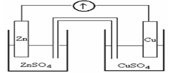 Рисунок 4.1 – Схема гальванического элемента Дениеля-Якоби Цинковый и медный полуэлементы соединены электролитическим мостиком. В гальваническом элементе различают внешнюю цепь – проводник 1-го рода (металл) и внешнюю цепь – проводник 2-го рода (раствор электролита). Во внешнюю цепь включен гальванометр. Цинковый электрод окисляется легче, чем медный, так как он имеет более отрицательный электродный потенциал. Таким образом цинковый электрод является анодом, а медный – катодом. После перехода электронов с цинкового электрода на медный, электродные потенциалы на обоих электродах нарушаются и для восстановления их значений происходит частичное окисление Zn и восстановление Cu+2. Накапливающиеся в анодном участке катионы цинка, а в катодном нескомпенсированные сульфат ионы создают во внутренней цепи ЭДС противоположную ЭДС внешней цепи. При равенстве этих ЭДС гальванический элемент прекратит работу. Для продолжения дальнейшей работы гальванического элемента оба полуэлемента соединяют электролитическим мостиком, который обеспечивает электропроводность внутренней цепи. В этом случае электрическая цепь будет замкнута и гальванический элемент будет работать до полного растворения цинкового электрода или восстановления ионов меди. На примере данного элемента покажем схематическую форму записи гальванического элемента и напишем реакции на аноде, катоде и во внутренней цепи. Схема гальванического элемента: (А) Zn| ZnSО4 || Cu| CuSО4 (К). Реакции на аноде и катоде: А) Zn – 2е = Zn2+, К) Cu2+ + 2е = Cu. Реакция, обеспечивающая проводимость во внутренней цепи: Zn2+ + SО42– = ZnSО4. Суммарная реакция, протекающая в ходе работы гальванического элемента, имеет вид: Zn + CuSО4 = Cu + ZnSО4. Электродвижущая сила гальванического элемента (ЭДС) равна разности электродных потенциалов двух полуэлементов. E = φ0(Cu2+/Cu)- φ0(Zn2+/Zn) = +0,34 - (-0,76) = 1,1 В. В общем виде – это разность потенциалов катодного и анодного процессов: