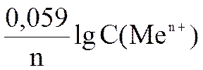 В электрохимическом ряду левее водорода расположены металлы стандартные электродные потенциалы которых имеют отрицательные значения,а правее – положительные значения. Например: φ0(Zn2+/Zn) = -0,76 В, φ0(Cu2+/Cu) = +0,34 В. Если условия отличаются от стандартных, то величину электродного потенциала рассчитывают по уравнению Нернста. Для металлического электрода уравнение имеет вид: