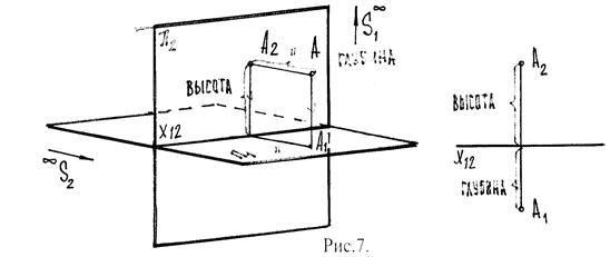 Мы разобрали наглядный чертеж в пространстве. Теперь необходимо дать плоское изображение этого чертежа. Для этого мысленно пл-ть π1 совмещают вращением вокруг оси Х12 с пл-тью π2. Перейдём от двугранного угла к плоскому чертежу (рис.7.). В ортогональных проекциях моделью точки является пара проекций. Проекционный чертеж, на котором плоскости проекций со всем тем, что на них изображено, совмещены определенным образом одна с другой, называется эпюром. При таком способе пр-ии А1 и А2 оказываются расположенными на одном перпендикуляре к оси Х12. При этом расстояние А1А12 – от горизонт. пр-ии точки до оси Х12 равно расстоянию от самой точки А до пл-ти π2, а расстояние А2А12 – от фронт. пр-ии точки до оси Х12 равно расстоянию от самой точки А до пл-ти π1. Виртуальные прямые линии, соединяющие проекции точки на эпюре, называются линиями проекционной связи, которые всегда должны быть ^ к оси. Итак, мы рассмотрели плоский черт. точки или эпюр Монжа.