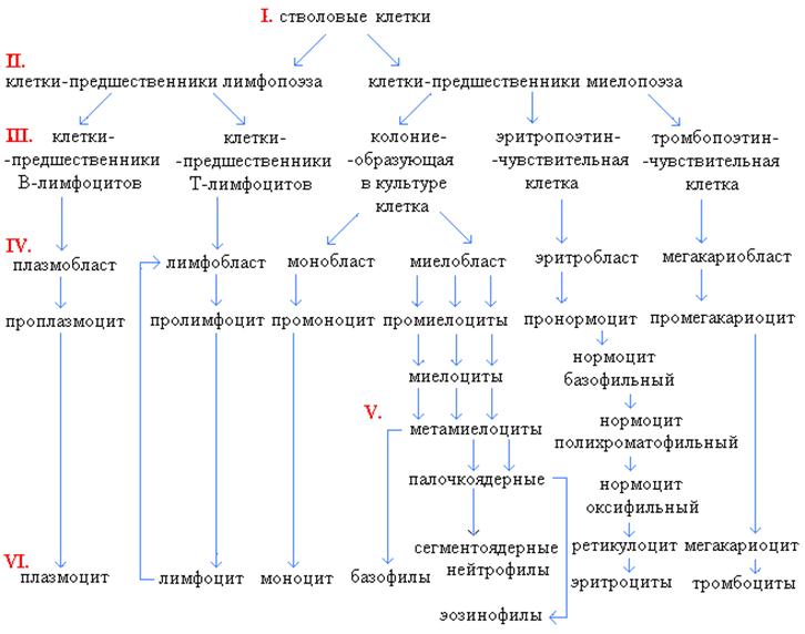 Схема кроветворения I. Класс полипотентных клеток-предшественников; II. Класс частично детерминированных полипотентных клеток-предшественников; III. Класс унипотентных клеток-предшественников; I, II, III классы – морфологически недифференцируемые; IV. Класс морфологически распознаваемых пролиферирующих клеток; V. Класс созревающих клеток; VI. Класс зрелых клеток.