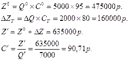 4.В результате увеличения объёмов производства снижается себестоимость продукции, т.к. постоянные расходы не меняются, а меняются только переменные. Новая себестоимость единицы составит: