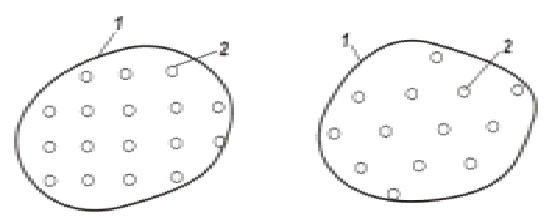 Рис.4. Расположение скважин по Рис.5. Расположение четырехточечной сетке скважин по трехточечной сетке 1- условный контур нефтеносности; 2- добывающие скважины Параметр плотности сетки скважин Так, при разработке месторождений сверхвязких нефтей (вязкостью в несколько тысяч 10 –3 Па·с) он может составлять 1 — 2 ·104 м2/скв. Нефтяные месторождения с низкопроницаемыми коллекторами (сотые доли мкм2) разрабатывают при При разработке месторождений с высокопродуктивными трещиноватыми коллекторами Для равномерной сетки скважин средние расстояния между скважинами вычисляют по следующей формуле: Формулу можно использовать для вычисления средних условных расстояний между скважинами при любых схемах их расположения.