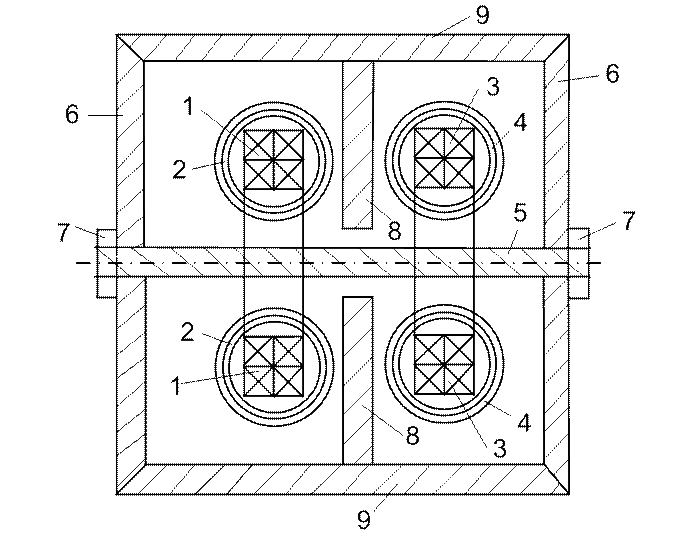 1 – торроидальное ферритовое кольцо для первичной обмотки; 2 – первичная обмотка; 3 - торроидальное ферритовое кольцо для вторичной обмотки; 4 – вторичная обмотка; 5 – электропроводящая шпилька; 6 – электропроводящая торцевая крышка; 7 – стягивающая гайка; 8 – электропроводящая перегородка, разъединяющая области обмотки; 9 – цилиндрическая электропроводящая обойма. Соединение деталей 5, 6, 7, 8 и 9 пропаивается. Для ввода и вывода сигнала первичной и вторичной обмоток трансформаторов в крышке 6 имеется отверстие. Детали 5, 6, 7, 8 и 9 образуют объемный виток связи между ферритовыми кольцами. Первичная и вторичная обмотки не имеют непосредственной индуктивной связи как в обычных трансформаторах, но каждая из них индуктивно связана с объемным витком. Рассмотрим принцип работы трансформатора: Переменный ток в первичной обмотке наводит переменный магнитный поток в ферритовом кольце 1, который в свою очередь наводит ЭДС в объемном витке, под действием которой там притекает переменный электрический ток, наводящий магнитный поток в ферритовом кольце 3, который в свою очередь наводит ЭДС во вторичной обмотке. Трансформатор с объемным витком связи обеспечивает лучшую гармоническую развязку первичной и вторичной цепи, чем обычный разделительный трансформатор за счет существенного уменьшения емкостной связи между обмотками. Перегородка 8 служит для дополнительного уменьшения емкостной связи между обмотками за счет закорачивания токов смещения на объемный виток. Полоса пропускания такого трансформатора может оказаться примерно на две декады больше, чем у обычного разделительного трансформатора.