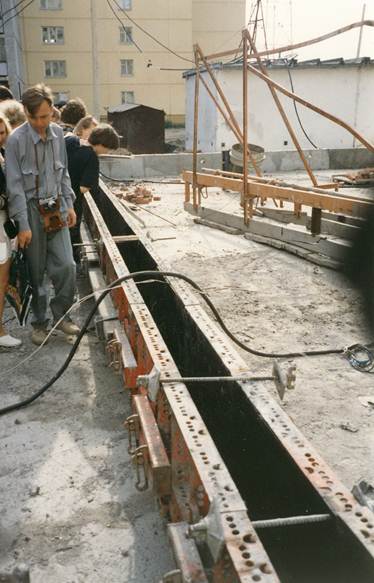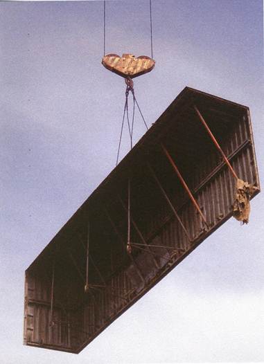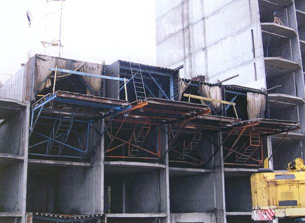 Половина щита объёмной опалубки (подача башенным краном к месту установки на здание).