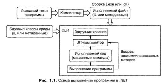 Программист пишет программу, компьютер ее выполняет. Программа создается на языке, понятном человеку, а компьютер умеет исполнять только программы, написанные на его языке — в машинных кодах. Совокупность средств, с помощью которых программы пишут, корректируют, преобразуют в машинные коды, отлаживают и запускают, называют средой разработки, или оболочкой. Среда разработки обычно содержит: 1. текстовый редактор, предназначенный для ввода и корректировки текста программы; 2. компилятор, с помощью которого программа переводится с языка, на котором она написана, в машинные коды; 3. средства отладки и запуска программ; 4. общие библиотеки, содержащие многократно используемые элементы программ; 5. справочную систему и другие элементы. Под платформой понимается нечто большее, чем среда разработки для одного язика. Платформа.NET (произносится «дотнет») включает не только среду разработки для нескольких языков программирования, называемую Visual Studio.NET, но и множество других средств, например, механизмы поддержки баз данных, электронной почты и коммерции. В эпоху стремительного развития Интернета — глобальной информационной сети, соединяющей компьютеры разных архитектур, важнейшими задачами при создании программ становятся: 1. переносимость —- возможность выполнения на различных типах компьютеров; 2. безопасность — невозможность несанкционированных действий; 3. надежность — способность выполнять необходимые функции в предопределенных условиях; средний интервал между отказами; 4. использование готовых компонентов — для ускорения разработки; 5. межъязыковое взаимодействие — возможность применять одновременно несколько языков программирования. Платформа.NET позволяет успешно решать все эти задачи. Для обеспечения переносимости компиляторы, входящие в состав платформы, переводят программу не в машинные коды, а в промежуточный язык (Microsoft Intermediate Language, MSIL, или просто IL), который не содержит команд, зависящих от языка, операционной системы и типа компьютера. Программа на этом языке выполняется не самостоятельно, а под управлением системы, которая называется общеязыковой средой выполнения (Common Language Runtime, CLR). Среда CLR может быть реализована для любой операционной системы. При выполнении программы CLR вызывает так называемый JIT-компилятор, переводящий код с языка IL в машинные команды конкретного процессора, которые немедленно выполняются. JIT означает «just in time», что можно перевести как «вовремя», то есть компилируются только те части программы, которые требуется выполнить в данный момент. Каждая часть программы компилируется один раз и сохраняется в кэше для дальнейшего использования. Схема выполнения программы при использовании платформы.NET приведена на рис. 1.1.