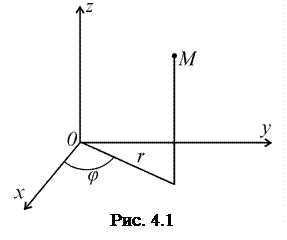 Очевидно, что если точка М имеет координаты С 1, С 2, С 3 то в этой точке пересекаются координатные поверхности q 1= C 1; q 2= C 2; q 3= C 3. Определение. Множество тех точек, вдоль которых изменяется только координата q 1 (а остальные две координаты q 2 и q 3 остаются постоянными), называется координатной линией q 1. Очевидно, что всякая координатная линия q 1 является линией пересечения координатных плоскостей q 2 и q 3. Аналогично определяются координатные линии q 2 и q 3. Пример 1. Координатными поверхностями (по координате x) в декартовой системе координат являются все плоскости x = const. (Они параллельны плоскости Оyz). Аналогично определяются координатные поверхности по координатам y и z. Координатная x -линия – это прямая, параллельная оси Оx. Координатная y -линия (z -линия) – прямая, параллельная оси Оу (оси Оz). Пример 2. Координатными поверхностями в цилиндрической системе являются: любая плоскость, параллельная плоскости Оxy (координатная поверхность z = const), поверхность кругового цилиндра, ось которого направлена по оси Оz (координатная поверхность r = const) и полуплоскость, ограниченная осью Оz (координатная поверхность j = const) (см. рис. 4.4). Название цилиндрическая система координат объясняется тем, что среди её координатных поверхностей имеются цилиндрические поверхности. Координатными линиями в этой системе являются z -линия – прямая, параллельная оси Оz; j -линия – окружность, лежащая в горизонтальной плоскости с центром на оси Оz; и r -линия – луч, выходящий из произвольной точки на оси Оz, параллельно плоскости Оxy.