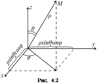 Ясно, что и в этом случае не только каждой точке М соответствует определённая тройка чисел r, q, j, где r ³ 0, 0£ q £ p, 0£ j £2 p, но и обратно, каждой такой тройке чисел отвечает определённая точка пространства (снова за исключением точек оси Оz, где эта однозначность нарушается). Легко найти связь между сферическими и декартовыми координатами: x = r sin q cos j; y = r sin q sin j; z = r cos q.