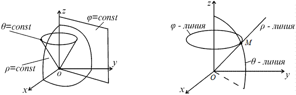 Пример 3. Координатными поверхностями в сферической системе координат служат сферы с центром в начале координат (поверхности r = const), полуплоскости, ограниченные осью Оz (поверхности j = const) и конические поверхности, с образующими, составляющими постоянный угол с положительным направлением оси Оz (поверхности q = const) (см. рис. 4.5).
