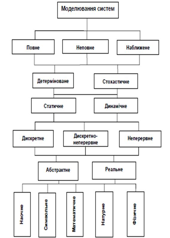 Рис. 3. Класифікація методів моделювання систем. Залежно від характеру досліджуваних процесів у системі моделювання поділяють на детерміноване та стохастичне, статичне та динамічне, неперервне та дискретно-неперервне. Детерміноване моделюваннявідображає процеси, для яких передбачається відсутність випадковихвпливів, а стохастичне враховує випадкові процеси та події. Статичне моделювання застосовується для описування стану системи у фіксований момент, а динамічне - для дослідження поведінки системи у часі. Дискретне, неперервне та дискретно-неперервне моделювання застосовують для опису процесів, які змінюються в часі. Залежно від форми подання об’єкта моделювання поділяють на реальне та абстрактне. При реальному моделюванні використовують можливість дослідженняхарактеристик на реальному об’єкті чи на його частині, а при натурному - проводять дослідження на реальному об’єкті з подальшим обробленням результатів експерименту на основі теорії подібності. Фізичне моделювання здійснюється через відтворення досліджуваного процесу намоделі, яка в загальному вигляді має відмінну від оригіналу природу,але однаковий математичний опис процесу функціонування. Абстрактне моделювання має різні види: наочне, символьне, математичне. При наочному на базі уявлень людини про реальні об’єктистворюють наочні моделі, що відображають явища та процеси, які відбуваються в об’єкті. Символьне моделювання - штучний процес створення об’єкта, що замінює реальний і виражає основні його властивості через певну систему знаків і символів. Воно поділяється, відповідно, на мовне та знакове. В основі мовного моделювання лежить деякий тезаурус, який утворюється із набору вхідних понять, причому цей набір маєбути фіксованим. Під тезаурусом розуміють словник, одиниці якого містять набори ознак, що характеризують родово-видові зв’язки та згруповані за змістовною близькістю. Між тезаурусом і звичайним словникоміснують принципові розбіжності. Тезаурус - це словник, який не міститьнеоднозначних слів; кожному його слову відповідає лише одне поняття. Дослідження математичної моделі дає змогу отримати характеристики реального об’єкта чи системи. Вигляд математичної моделі залежитьяк від природи системи, так і від завдань дослідження. Математична модель системи містить, як правило, опис множини можливих станів системи та закон переходу з одного стану в інший. Математичне моделювання охоплює імітаційне, інформаційне, структурне, ситуаційне тощо. При імітаційному моделюванні намагаються відтворити процесфункціонування системи у часі за допомогою деяких алгоритмів. Прицьому імітуються основні явища, що утворюють процес, який розглядається, із збереженням їх логічної структури та послідовності перебігу вчасі. Це уможливлює отримання інформації про стан процесу в певниймомент та оцінку характеристик системи. Імітаційні моделі дають змогувраховувати такі ознаки, як дискретність і неперервність елементів системи, нелінійність їхніх характеристик, випадкові збурення тощо. Інформаційне (кібернетичне) моделювання пов’язане з побудовою моделей, для яких відсутні безпосередні аналоги фізичних процесів. У такому разі намагаються відобразити лише деяку функцію і розглядають об’єкт як “чорну скриню”, що має певну кількість входів і ви