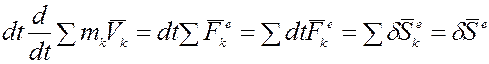 - элементарный импульс главного вектора внешних сил, приложенных к системе материальных точек; Окончательно: Теорема импульсов (механической системы): Изменение количества движения механической системы за некоторый промежуток времени равно геометрической сумме элементарных импульсов внешних сил, приложенных к системе, за тот же промежуток времени. Или, после приведения системы сил к ее Главному вектору: (Изменение количества движения механической системы за некоторый промежуток времени равно элементарному импульсу Главного вектора внешних сил, приложенных к системе, за тот же промежуток времени).