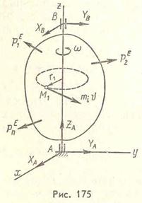 Рассмотрим твердое тело, вращающееся вокруг неподвижной оси Z с угловой скоростью ω (рис. 175). где Кинетический момент твердого тела относительно оси Z: Здесь т. е. кинетический момент вращающегося твердого тела относительно неподвижной оси его вращения равен произведению момента инерции тела относительно той же оси на угловую скорость тела. Рассмотрим изменение кинетического момента тела относительно оси Z под действием приложенных к нему задаваемых внешних сил Реакции подшипника В и подпятника А являются внешними силами, но при отсутствии трения их моменты относительно оси Z равны нулю, и правая часть уравнения (56.2) содержит только сумму моментов задаваемых внешних сил. При наличии трения эта сумма содержит также момент сил трения. Так как по (79.1) То а потому уравнение (56.2) принимает вид Уравнение (79.2) представляет собой дифференциальное уравнение вращения твердого тела вокруг неподвижной оси. Сравним уравнение (79.2) с дифференциальным уравнением поступательного прямолинейного движения твердого тела: Очевидно, что момент инерции твердого тела при вращательном движении имеет то же значение, что и масса тела при его поступательном движении: момент инерции является характеристикой инертности тела при вращательном движении. Если вращение тела происходит в одном направлении, то это направление считают положительным. В этом случае моменты движущих сил положительны, моменты сил сопротивления отрицательны, а главный момент внешних сил может иметь тот или другой знак. Если Если Если По дифференциальному уравнению (79.2) можно решать следующие задачи: 1) по заданному уравнению вращения тела 2) по заданным внешним силам, приложенным к телу, по начальным условиям вращения 3) определять момент инерции тела Jz относительно оси вращения, зная величины