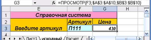 С помощью функции ПРОСМОТР() можно организовать информационно-справочную систему. Например, по вводимому артикулу можно определить цену соответствующего товара. На рисунках ниже видно, как в ячейку F3 поочередно вводятся разные артикулы, а в ячейке G3 (в которой введена формула с функцией ПРОСМОТР) отображается соответствующая цена товара.