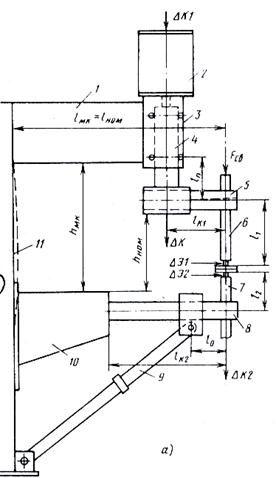 Рис. 6.2. Схема возможных перемещений и деформаций элементов вторичного контура точечной машины. Жесткость конструктивных элементов оценивают по упругим смещениям электродов при номинальном усилии сжатия. Например, при L ≤ 500 мм смещение не должно быть более 1 мм, при L =500…1200 мм - не более 1,5 мм, а при L ≥ 1200 мм смещение не должно превышать 2мм. Прогиб свободного конца консоли можно рассчитать по известной формуле: f=Fсв·L3/(48·E·J); J=π·d4/64=0,05·d4 (осевой момент инерции). d-диаметр консоли; E- модуль упругости; L-длина расчетной части консоли; Fсв - усилие сжатия. Таблица 6.1. Прогиб консоли и относительное смещение электродов