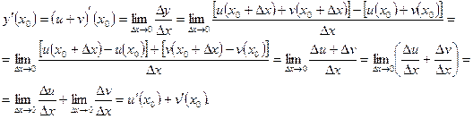 Теорема доказана. Кратко правила дифференцирования можно сформулировать так: Правило 1. Производная суммы двух дифференцируемых функций равна сумме производных этих функций. Замечание. Правило 1 распространяется на случай суммы любого конечного числа функций. Правило 2. Производная разности двух дифференцируемых функций равна разности производных этих функций. Правило 3. Производная произведения двух дифференцируемых функций равна сумме произведений производной первого сомножителя на второй сомножитель и первого сомножителя на производную второго сомножителя. Правило 4. Постоянный множитель можно выносить за знак производной. Правило 5. Производная дроби двух дифференцируемых функций равна произведению производной числителя на знаменатель минус произведение числителя на производную знаменателя и полученную разность разделить на квадрат знаменателя. Пример …Найти производную функции Решение. Используя правило 1 и табличные формулы (9) и (11), получаем
