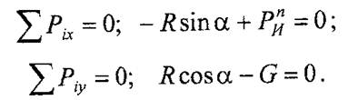 2. Применяя принцип Даламбера, приложим к грузу силу инерции РnИ, реакцию нити R и составим уравнение равновесия относительно выбранных осей х и у, т.е.
