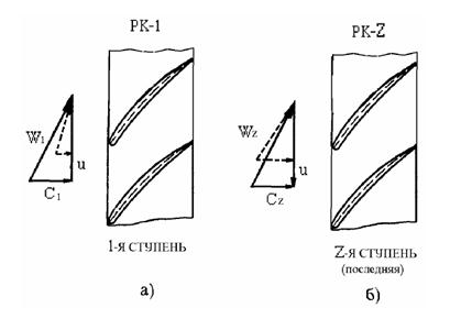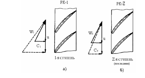 Рис. 6.13. Изменение характера обтекания лопаток РК первой и последней ступеней компрессора при увеличении частоты вращения ротора — треугольник скоростей на расчетном режиме работы (n=nрасч) ---- треугольник скоростей на нерасчетном режиме работы (n<nрасч)