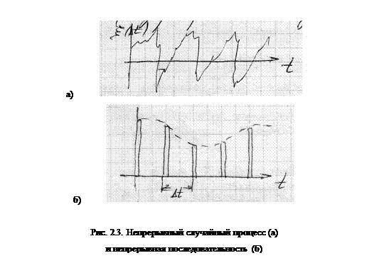 Случайные последовательности и случайные процессы с непрерывным временем называются дискретными (рис. 2.2), если пространство значений конечное или счетное, и непрерывными (рис 2.3), если множество – континуум.