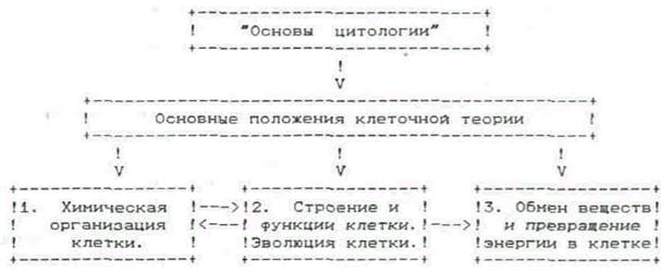 ЛЕКЦИОННО-СЕМИНАРСКАЯ СИСТЕМА ИЗУЧЕНИЯ ТЕМЫ "ОСНОВЫ ЦИТОЛОГИИ" (13 ч) Урок 1. Цитология как наука. Клеточная теория (вводная лекция). Урок 2. Химический состав клетки. Неорганические соединения клетки. Вода и ее биологическая роль в клетке.(Методика интегрированного урока). Урок 3. Органические вещества клетки. Углеводы и липиды. Их биологическая роль.(Методика традиционная). Урок 4,5. Органические вещества клетки. Белки. Нуклеиновые кислоты. Роль в клетке. (Методика традиционная или проблемные лекции). Урок 6,7. Строение и функции органоидов клетки. (Методика традиционная). Урок 8. Строение и функции ядра клетки. Прокариоты и эука-риоты. (Обзорная лекция или традиционная методика). Урок 9. Обмен веществ и энергии в клетке. Роль АТФ в обмене (Обзорная лекция). Урок 10.11. Особенности пластического обмена в животной клетке. Биосинтез белка. (Тематическая лекция). Урок 12. Особенности пластического обмена в растительной клетке. Фотосинтез. Космическая роль фотосинтеза. (Тематическая лекция). Урок 13. Семинар по теме: "Основы цитологии". Урок 14. Зачет.