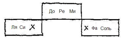 Мы получим симметричную структуру из трех триад, то есть, триаду триад, три здесь равнозначно триединству. Законы симметрии мало изучены на западе, но даже в этом случае вы возможно знаете, что называется симметричной асимметрией, то есть симметрией, основанной на законах, выглядящей как асимметрия. И символ, который мы сейчас исследуем, представляющий сам по себе рисунок совершенного синтеза законов октав, хотя симметричен по форме, также включает ту асимметрию, о которой мы сейчас говорим (см. рисунок). Но это не все: помещая пропуск туда, где он как бы не на своем месте, он показывает тому, кто знает, как его прочитать, какой толчок нужен в том месте, чтобы пройти от «си» к «до», что в свою очередь объясняет то, о чем было упомянуто в лекции о механике структуры мира, а именно, что переход от «ля» к «си» есть с точки зрения различия в количестве вибраций нот, большей длины, чем все другие переходы в октаве. Так же определенны в этом символе указания на толчок, который нужен в интервале «ми»-«фа», о котором я не могу говорить сейчас в деталях. Все, что я могу сделать – это напомнить вам еще раз о роли этих толчков в тех процессах, которые протекают в человеке и во Вселенной. Когда мы изучали применение закона октав к космосу, он принимал такую форму в отношении к интервалу «Солнце-Земля»:
