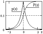1. Интервал определения функции: 0 £ P(x) £ 1, - ¥ < x < ¥. 2. P(-¥) = 0, P(¥) = 1. 3. P(x) не уменьшается при возрастании х. 4. P(x1<X £ x2) = P(x2) - P(x1). На рис. 8.3.2 приведен пример функции плотности вероятностей p(x) = (a/2)exp(-a|x|) и соответствующей функции вероятностей P(x). Аналогичным описанием для случайных дискретных величин является непосредственно дискретное распределение вероятностей их значений: Pi(x) = P(xi < Xi £ xi+1),