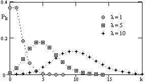 Нормальное распределение играет большую роль в теории вероятностей и в математической статистике. Основная особенность его заключается в том, что оно является предельным законом, к которому при определенных условиях приближаются другие законы распределения. В частности, независимые случайные величины Х1, Х2,..., Хn, подчиненные каким угодно законам распределения (с весьма небольшими исключениями), при суммировании и других линейных комбинациях дают распределения, сколь угодно близкие к нормальному закону. Это позволяет нормальному распределению служить хорошей математической моделью для большинства многофакторных физических процессов. Линейные комбинации случайных гауссовских величин всегда являются гауссовскими. Распределение Пуассона является широко распространенным распределением случайных целочисленных дискретных величин. Оно задается только одним параметром l, значение которого равно среднему значению случайных величин распределения и одновременно задает значение дисперсии распределения: Pk =
