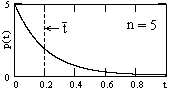 Пример. Средняя скорость счета фоновых гамма-квантов детектором радиометра составляет m = 1 импульс в секунду. Возможные экспозиции единичного измерения равны 1, 5 и 10 секунд. Все три условия справедливости закона Пуассона для процесса регистрации квантов выполнены. Значение l для распределения (8.3.16) будет определяться выражением l = mT, где Т - экспозиция измерения. Расчетные значения вероятностей Pk для трех различных экспозиций приведены на рис. 8.3.11. Попутно заметим, что значение l для закона Пуассона не обязано быть целочисленным. Как видно на рис. 8.3.11, распределение Пуассона резко асимметрично при малых значениях l. По мере роста l распределение становится симметричным относительно Экспоненциальное распределение. Этим законом отображается, например, распределение длительности интервалов между случайными событиями, соответствующими закону Пуассона, непосредственно из которого оно и может быть получено. Допустим, что для рассматриваемого явления значение l распределения Пуассона определяется выражением l = nt, где n - среднее количество событий на единице интервала t (средняя скорость следования событий, если t - время). Длительность интервала между двумя последовательными событиями будет равна t+dt, если на интервале t не будет ни одного события (вероятность чего в соответствии с (8.3.16) равна Р0 = (nt)0×e-nt/0! = e-nt), а на интервале dt Þ 0 произойдет одно событие (вероятность P1 = (ndt)1×e-ndt/1! = ndt, так как e-ndt Þ 1 при dt Þ 0). События в неперекрывающихся интервалах являются статистически независимыми, а, следовательно, искомая вероятность p(t)dt интервала t будет равна произведению вероятностей Р0 и Р1, т.е. p(t)dt = e-nt×ndt, откуда получаем выражение для плотности распределения вероятностей случайной непрерывной величины t: p(t) = n×e-nt, t ³ 0. (8.3.17)