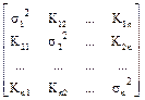 Корреляционные моменты является количественной мерой степени статистической связи (взаимной зависимости или корреляции) случайных величин Хi и Хj. Для системы случайных некоррелированных величин матрица корреляционных моментов является диагональной матрицей дисперсий с нулевыми значениями Kij при i ¹ j (см. пример матрицы si2). Из выражений (8.4.13) и (8.4.14) следует достаточно простая связь между ковариационными и корреляционными моментами: Kij = Rij - В качестве безразмерной нормированной характеристики степени корреляции случайных величин используют также понятие коэффициентов корреляции, которые также образуют симметричную относительно главной диагонали матрицу со значениями, равными 1, по главной диагонали: rij = Kij /(sisj) = (