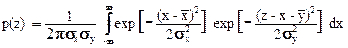 Если случайные величины не коррелированны, то дисперсия их суммы или разности равна сумме их дисперсий. Плотность вероятностей суммы (разности) случайных величин по известным плотностям вероятностей суммируемых величин в общем случае определяется достаточно сложно. Задача значительно облегчается, если случайные величины статистически независимы. Рассмотрим этот случай на примере случайной двумерной величины Z=X+Y с известными плотностями вероятностей px(x) и py(y). Совместная плотность вероятностей p(z) = p(x,y) определяет функцию распределения вероятностей P(z) = P(Z £ z) = P(X+Y £ z), причем для каждой совместной реализации имеем z=x+y и, соответственно, x=z-y и y=z-x. Отсюда, с учетом статистической независимости случайных величин X и Y, и, соответственно, p(x,y) = px(x)×py(y), для распределения вероятностей P(z) имеем: P(z) = Продифференцируем данное выражение по z и, поскольку переменная z присутствует только в верхнем пределе второго интеграла, получим: d P(z)/dz º p(x,y) = Аналогично, если принять y=z-x в качестве верхнего предела во втором интеграле выражения (8.3.19), можно получить: p(x,y) = Таким образом, двумерная плотность вероятностей суммы случайных величин равна свертке их одномерных плотностей распределения вероятностей. Для разности случайных величин Z=X-Y в выражении (8.3.19) верхний предел заменяется соответственно на z+y, при этом: p(x,y) = Сумма и разность нормальных распределений. Плотность вероятностей суммы Z=X+Y двух нормальных распределений случайных величин X и Y получается непосредственной подстановкой выражений гауссовских распределений (8.3.15) в (8.4.20):