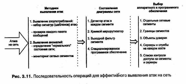 Выявить же злоумышленника в основном не представляет особой сложности по следующим его действиям: – предпринимает повторные попытки вторжения в сеть; – допускает очевидные ошибки; – предпринимает попытки атаки в разное время в течение дня; – хочет скрыть свои следы. В случае неудачной попытки доступа к серверу случайные злоумышленники оставят вас в покое. С другой стороны, опытные злоумышленники постараются собрать информацию о сервере, чтобы вернуться позже и попытаться использовать другие слабости. Например, в один прекрасный день при просмотре журналов IDS вы обращаете внимание на то, что кто-то сканирует ваш почтовый сервер в поисках открытых портов TCP и UDP. Двумя днями позже IP-адрес злоумышленника всплывает вновь, но на этот раз злоумышленник нацеливается на открытые порты. Несколько часов спустя он вводит последовательность команд SMTP через порт 25. Каждое нажатие клавиши во время атаки дает ценную информацию об опыте атакующего. Серьезный хакер не позволит себе терять драгоценное время на синтаксические ошибки и метод проб и ошибок. Попытка ввести команды SMTP через порт NNTP служит ясным свидетельством неопытности атакующего. Картина доступа может дать такие важные сведения о злоумышленнике, как его местонахождение, профессия и возраст. Большинство случайных атакующих осуществляют свои попытки между 9 часами вечера и 1 часом ночи. Если попытки проникновения имеют место по будним дням с 9 утра до 5 вечера, то наверняка они производятся с рабочего места. Были ли случаи, когда при проверке системных журналов событий вы обнаруживали, что все записи за последние 12 часов пропали? Когда-либо замечали, что файл истории команд для бюджета root таинственно исчез? Это признаки опытного атакующего. Он позаботился об удалении всех свидетельств своих действий, не опасаясь, что это приведет к подаче тревожного сигнала. Такое поведение аналогично действиям грабителя, поджигающего дом перед тем, как бежать оттуда с награбленным. Существенную помощь администратору в данном случае могут оказать системы выявления атак. Хотя системы выявления атак до сих пор считаются экспериментальными, они стали значительно совершеннее с момента первого их использования (1988 г.), причем до такой степени, что они заняли свое собственное место в системе обороны сети наравне с брандмауэрами и антивирусным программным обеспечением. Хотя практические реализации таких систем, как правило, достаточно сложны и нестандартны, общая концепция выявления атак на удивление проста и состоит в проверке всей активности сети (как входящей, так и исходящей) и обнаружении подозрительных действий, которые могли бы свидетельствовать об атаке на сеть или систему. Эффективность выявления атак на сеть может быть повышена при выполнении последовательности операций, которые представлены на рис. 3.11.
