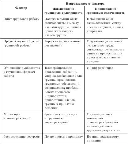 Факторы, влияющие на групповую сплоченность. Групповая сплоченностьГрупповая сплоченность Ситуационные характеристики группы Размер группы. Исследования показывают, что наиболее эффективны группы, состоящие из 5-7 человек. С увеличением размера группы усложняется общение между ее членами, труднее достигается согласие в деятельности при выполнении задач, отдельным членам групп не уделяется достаточно времени, они испытывают затруднения, робость в высказывании собственного мнения перед другими. В группах из 2-3 человек возникает напряженность между ее членами, они обеспокоены слишком очевидной персональной ответственностью за принимаемые решения. Пространственное расположение. Характеризует размещение людей во время работы по отношению друг к другу: сидят лицом или спиной друг к другу. Важны три характеристики пространственного расположения человека в процессе работы, влияющие на взаимоотношения между человеком и группой: • наличие постоянного места или территории; • личное пространство, в котором находится только данный человек; • взаимное расположение рабочих мест. Задачи, решаемые группой. Их содержание определяет специфику работы группы и организацию группового процесса. Особенно важно определить частоту и качество взаимодействий членов группы в процессе решения задачи в зависимости от ее сложности. Система вознаграждений должна иметь ценность для членов группы, вознаграждение должно восприниматься как заслуженное и побуждать к выполнению общих задач. Групповая сплоченность – одна из важнейших характеристик группы. Под сплоченностью понимается сила стремлений членов группы оставаться в ней и выполнять свои обязательства перед группой. Как правило, чем более сплоченной является группа, тем выше результаты ее работы. Групповая сплоченность оказывает влияние на результаты деятельности не только группы, но и всей организации в целом. Если групповые цели согласуются с целями организации, а нормы поведения, принятые в группе, нацелены на достижение высоких результатов работы, то эффективная деятельность группы обеспечивает и эффективность деятельности организации. На групповую сплоченность оказывают влияние различные факторы, которые могут как повышать ее, так и существенно ее снизить (табл. 5.2.2). Таблица 5.2.2