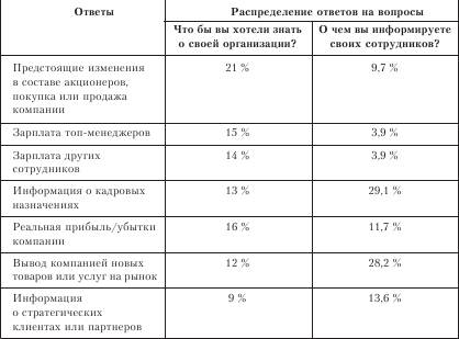 Интересный опыт Все сотрудники хотят получать информацию о своей компании. Какую? Готовы ли менеджеры им ее давать; Какую информацию они готовы предоставить? Ниже приводятся результаты опроса трехсот сотрудников и менеджеров российских компаний (табл. 7.2.4). Таблица 7.2.4 Распределение результатов опроса[41]