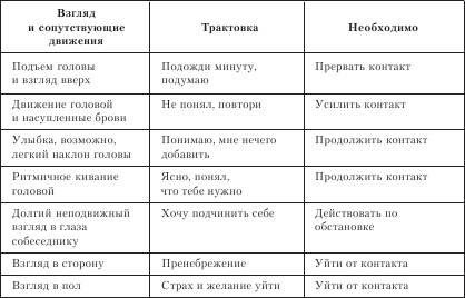 Взгляд – наиболее естественное средство невербального общения (табл. 7.3.4). Направление взгляда показывает, на кого (или на что) направлено внимание собеседника, а также дает обратную связь, т. е. показывает, как собеседник относится к сообщению. Взгляд используется для установления взаимоотношений. Когда человек хочет установить более теплые взаимоотношения с собеседником, он ищет его взгляд. Слишком долгий взгляд в ваши глаза настораживает. Во время общения взгляд говорящего должен встречаться с глазами собеседника около 60-70 % всего времени общения. Меньшее время контакта свидетельствует о недоверии к собеседнику. Не рекомендуется во время деловых бесед и переговоров одевать темные очки, иначе собеседник думает, что его разглядывают в упор. С помощью глаз передаются самые точные и открытые сигналы межличностной коммуникации, так как они занимают центральное место на лице человека и, кроме того, расширение и сужение зрачков не поддается сознательному контролю.